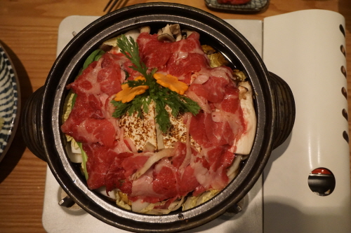 ‘스키야키’란 간장·설탕 등으로 만든 소스에 얇게 썬 쇠고기와 대파, 두부, 배추, 실곤약 등의 재료를 넣고 자작하게 졸여 먹는 나베 요리랍니다. 일본에서도 손님이 오거나 특별한 날에 해 먹던 가정식이라고 해요.