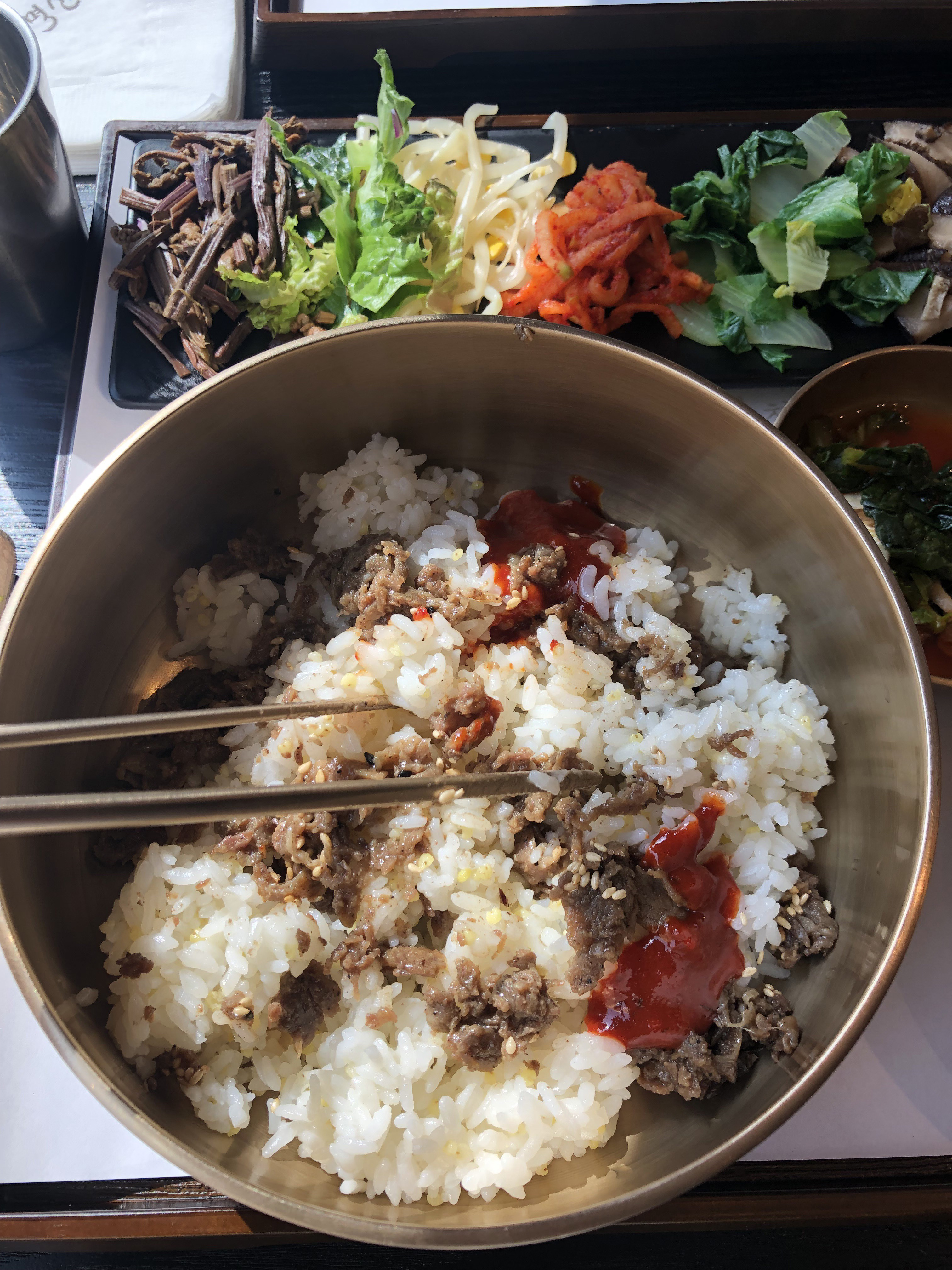 셰어할 필요 없이 한 쟁반에 밥과 찬이 따로 나오는데 산방비빔밥, 곤드레 된장 비빔밥, 두부 된장 비빔밥, 육회비빔밥 등 입맛 따라 고를 수 있는 대여섯 가지의 메뉴가 있어요. 빛깔 고운 특제 고추장을 넣어 젓가락으로 밥알이 으깨지지 않게 살살 비벼 먹으면 ‘엄지 척’이죠. 매운 걸 못 드시는 외국인을 위한 특제간장소스도 있답니다.