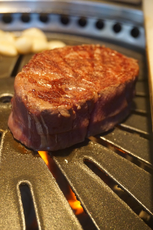 고기는 시작부터 끝까지 직원이 숙련된 솜씨로 구워 주니 편하게 입 속으로 줍줍하면 돼요. 육즙과 육향이 잘 느껴지는 고기 한 점을 입안에서 영접하면 이때만은 세상 부러울 것이 없죠. 양념으로는 명품 소금과 생와사비가 준비돼 있고요. 마늘·양파·레드페퍼 등을 넣은 버터소스는 거의 반칙 수준의 조합. 식사로 나오는 된장찌개 맛도 일품인 데다 주물솥에 바로 지어나오는 밥과 육회비빔밥도 퀄리티가 만만찮답니다.