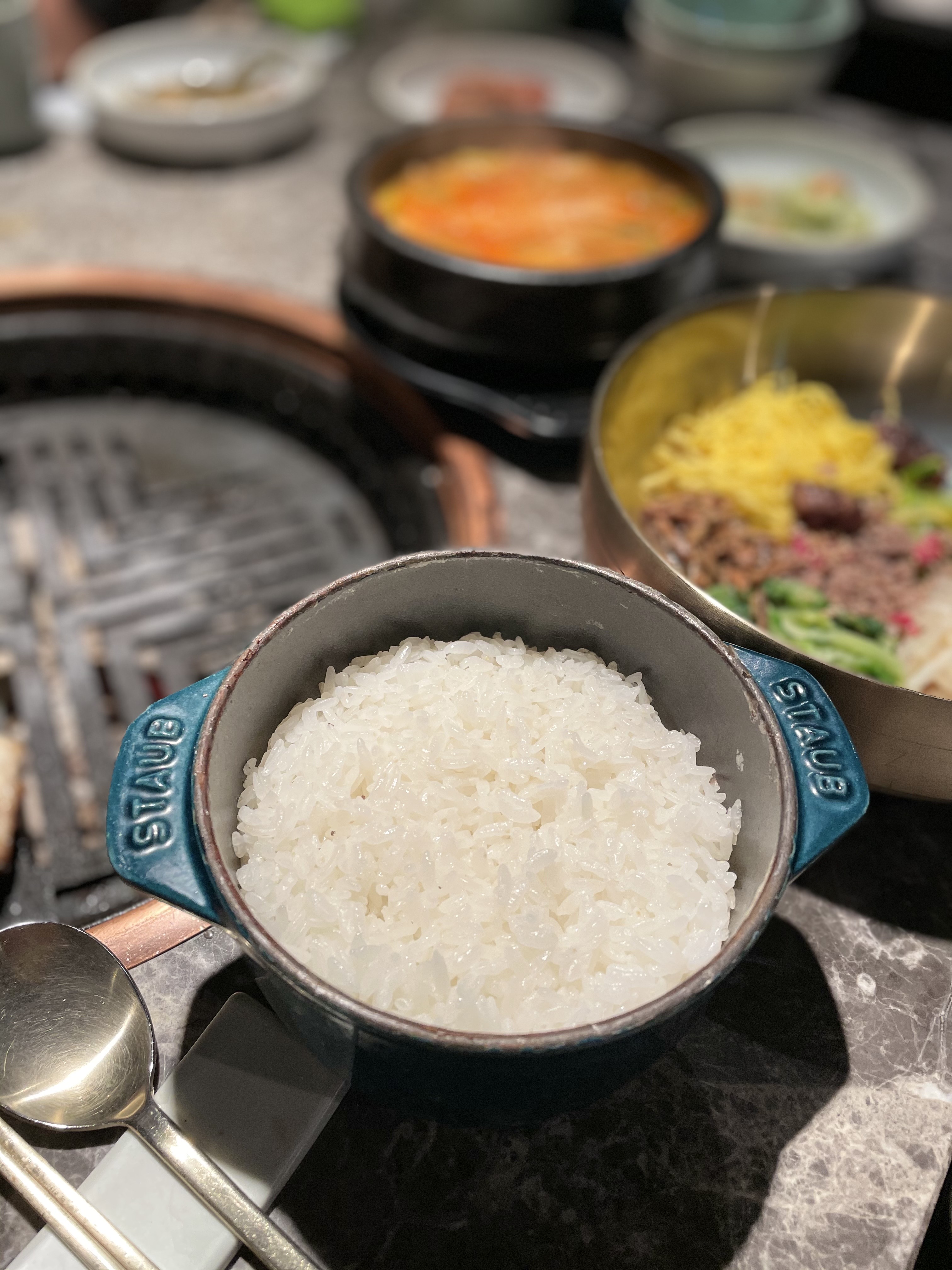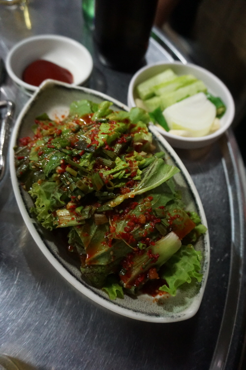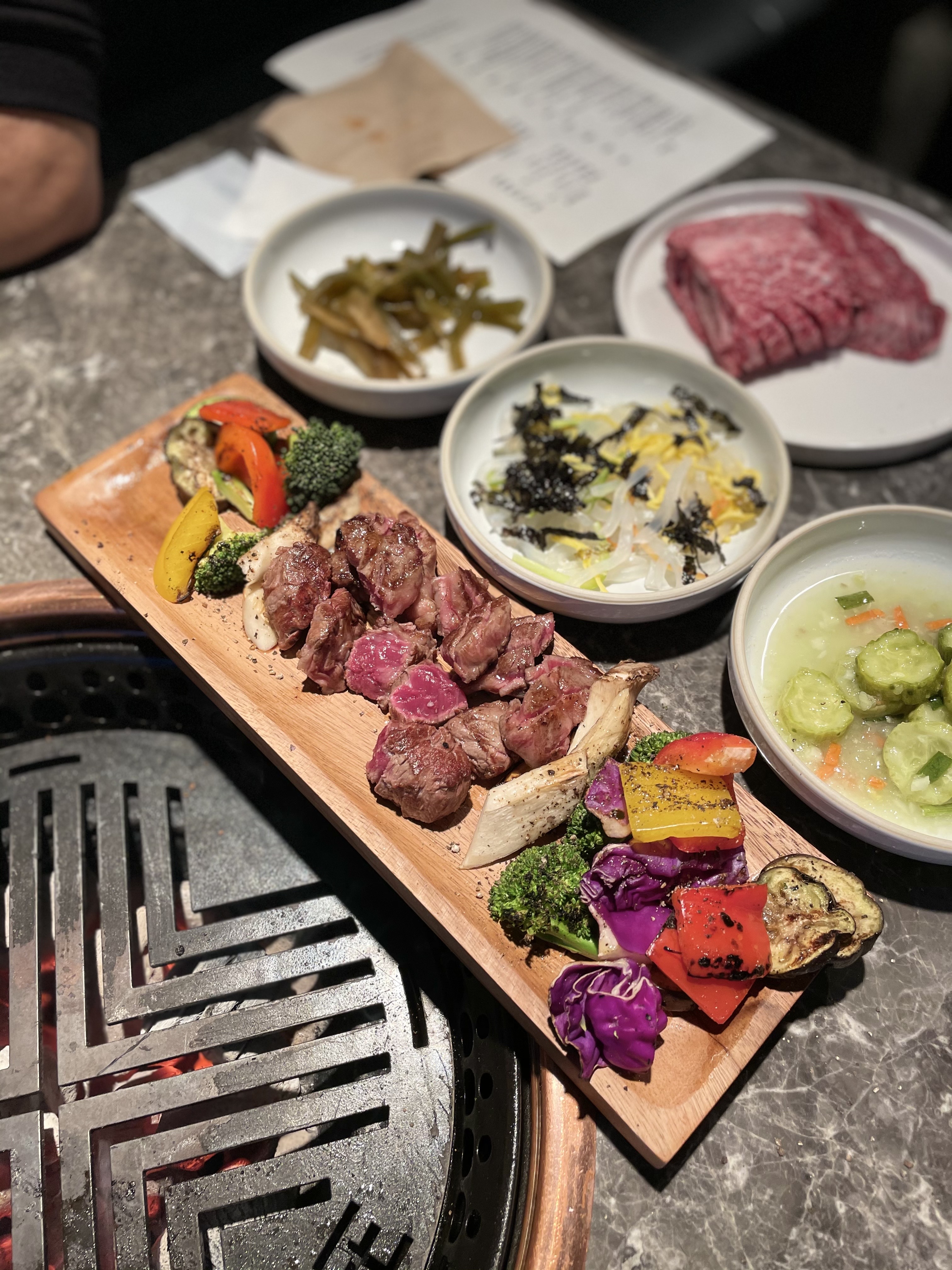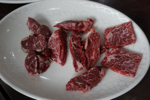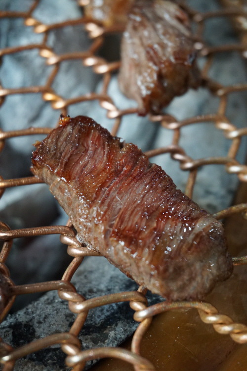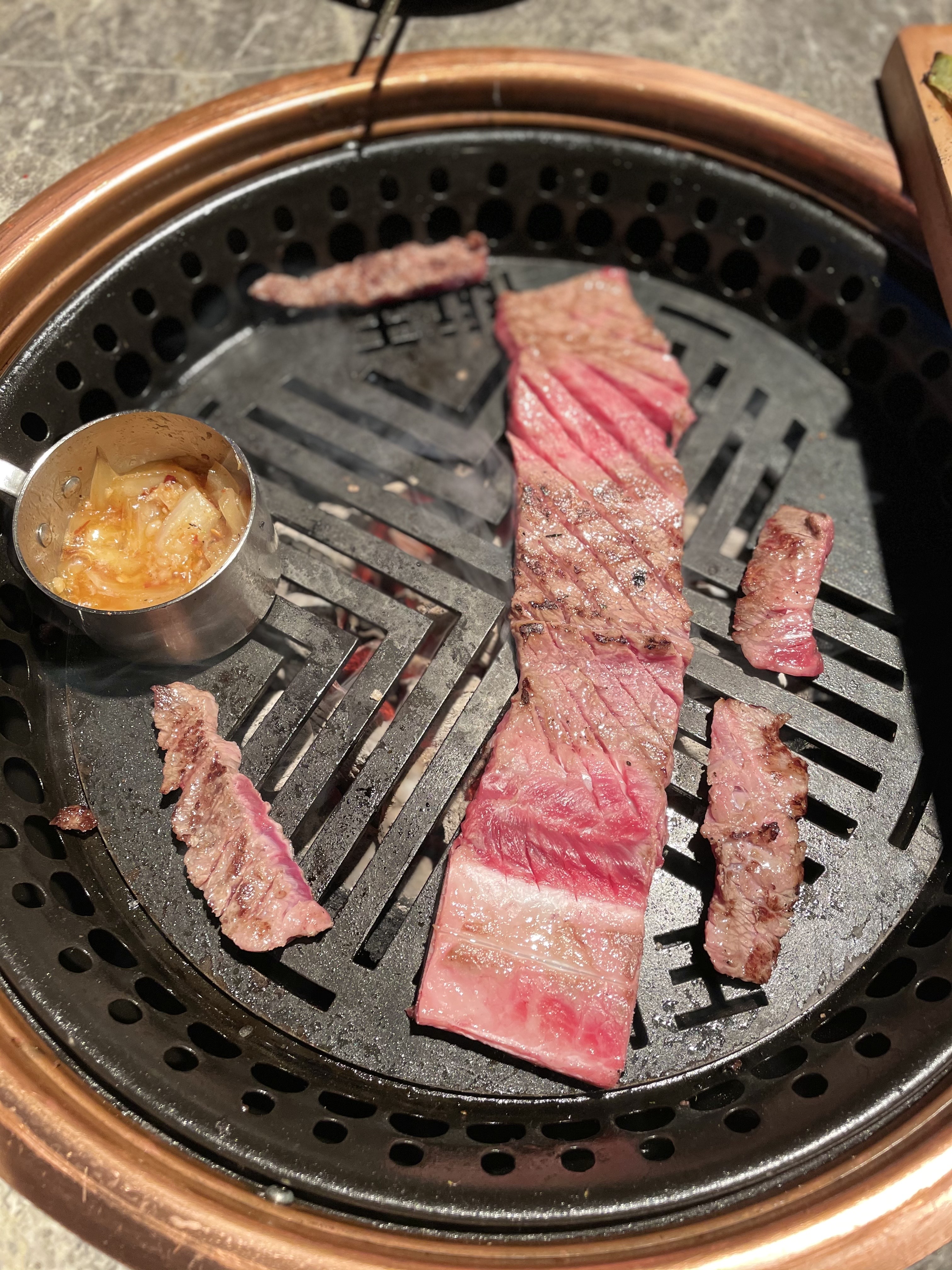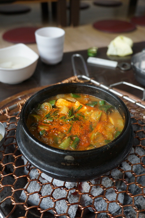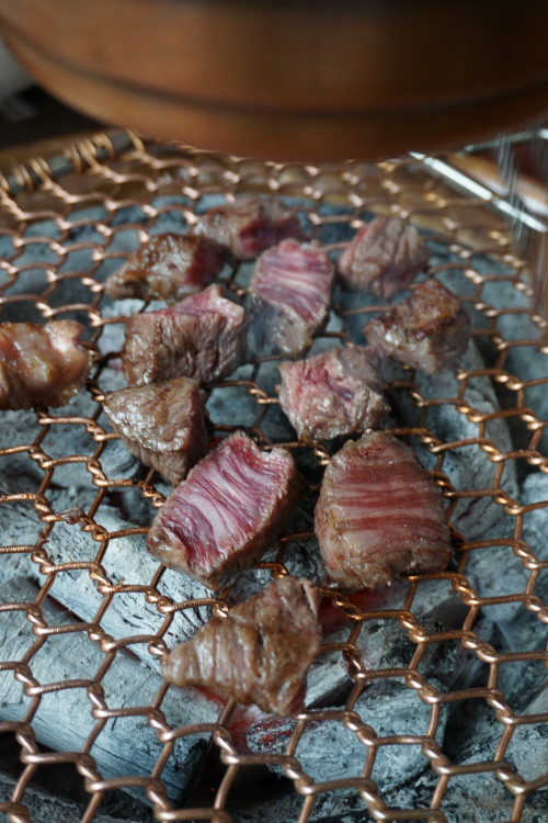 안창·치마·토시 등 특수부위 모둠으로 맛봤는데요. 소의 내장 부위를 감싸고 있는 이 부위들은 안심이나 등심 등 뼈에 붙어 있는 고기보다 육향이 진한 것이 특징이죠. 한우 투플러스 등급을 사용한다고 하니 일단 육질의 상태는 뭐 물어보나마나죠. 질 좋은 백탄을 숯으로 사용하고 구리 불판을 써서 불맛이 더욱 배가되는 듯. 된장찌개도 집에서 끓인 듯 맛깔나서 ‘굿’입니다.
