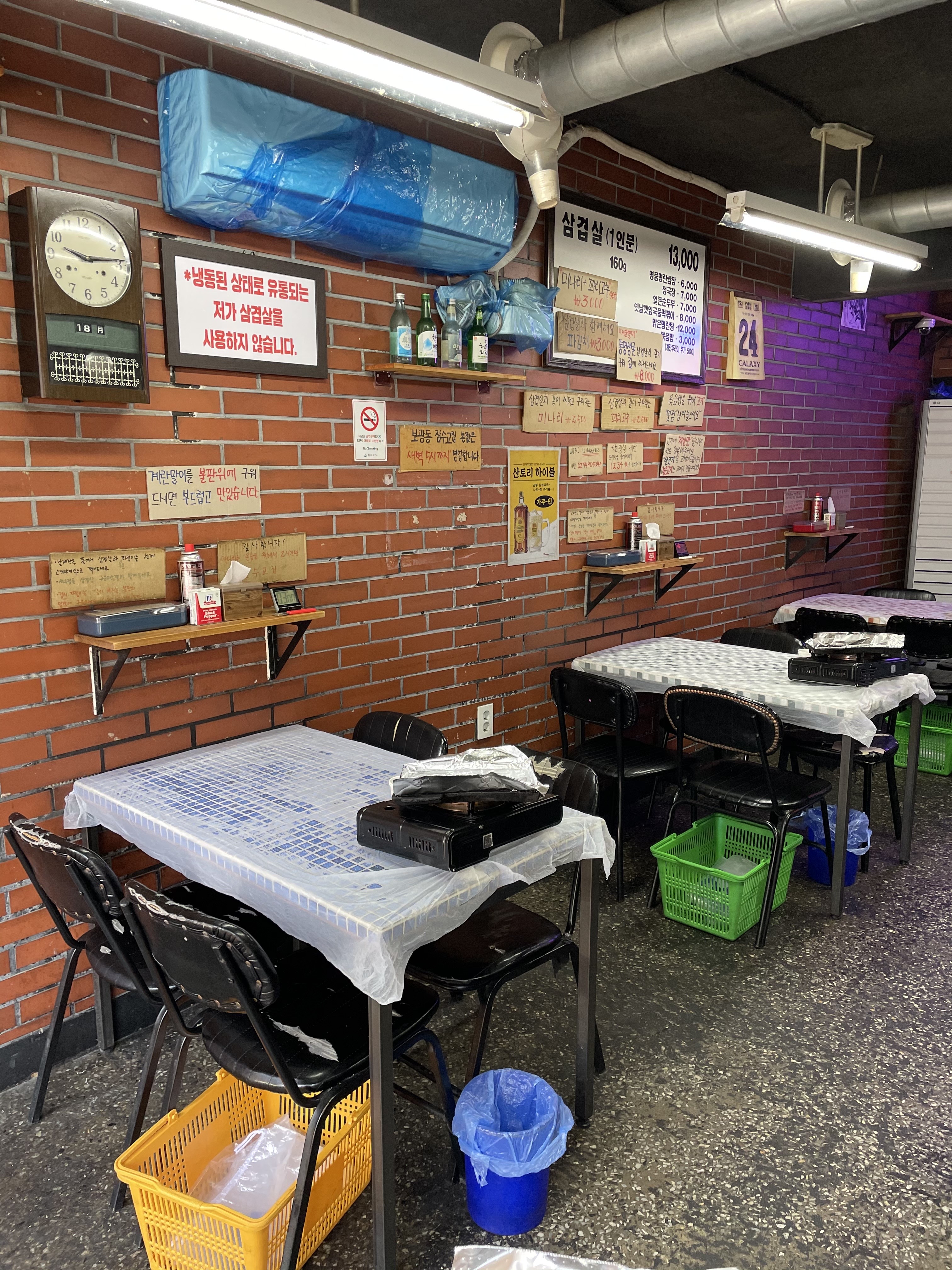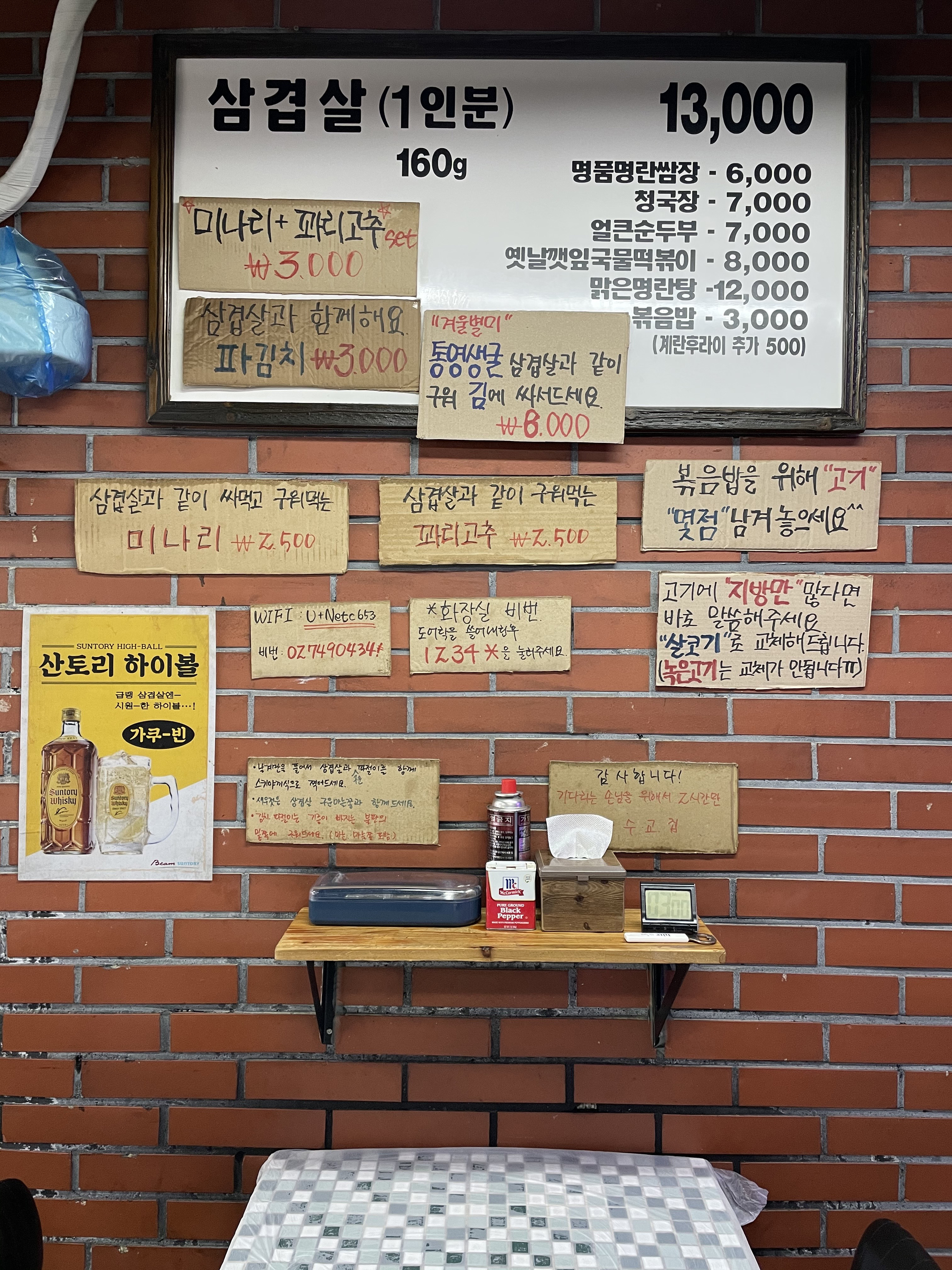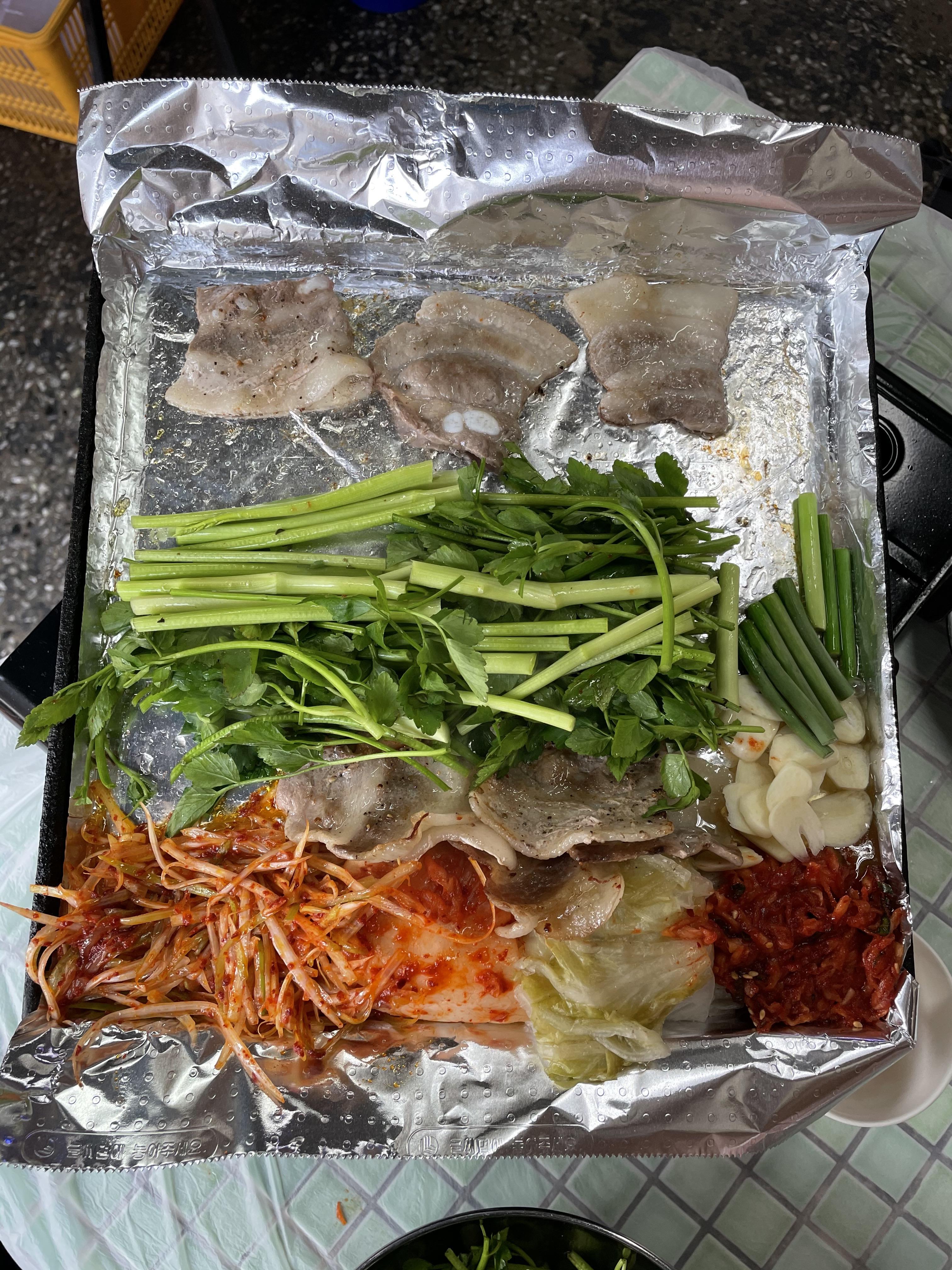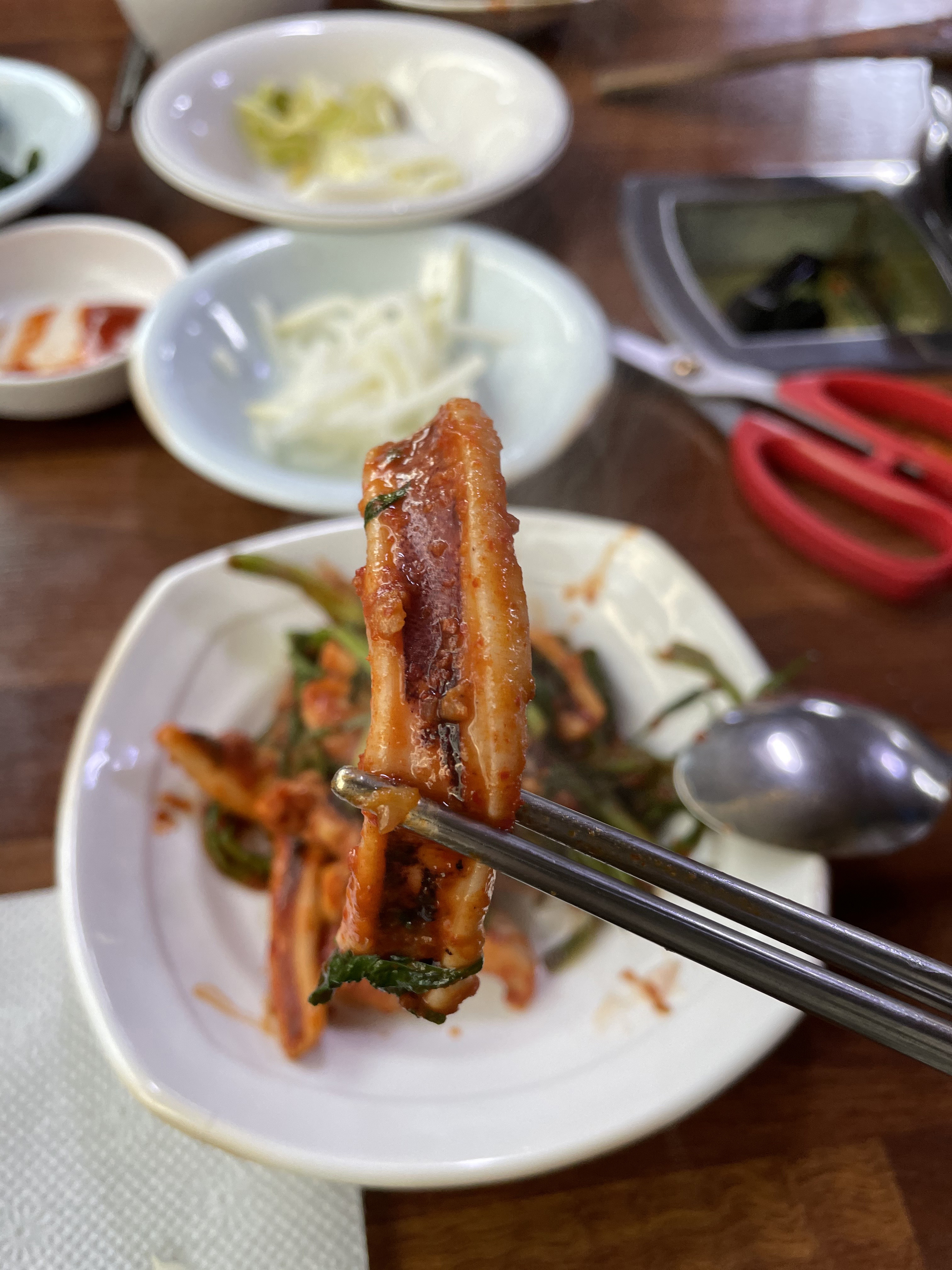 거기에 미나리(3000원)를 추가해서 먹는 게 화룡점정. 미나리+삼겹살은 요즘 배우신 분들이라면 즐겨 먹는 조합이죠. 불판에서 함께 구운 미나리를 칙칙 앞뒤로 재빨리 구운 삼겹살로 동그랗게 싸서 입에 쏙 넣으면 궁합이 아주 딱이에요.