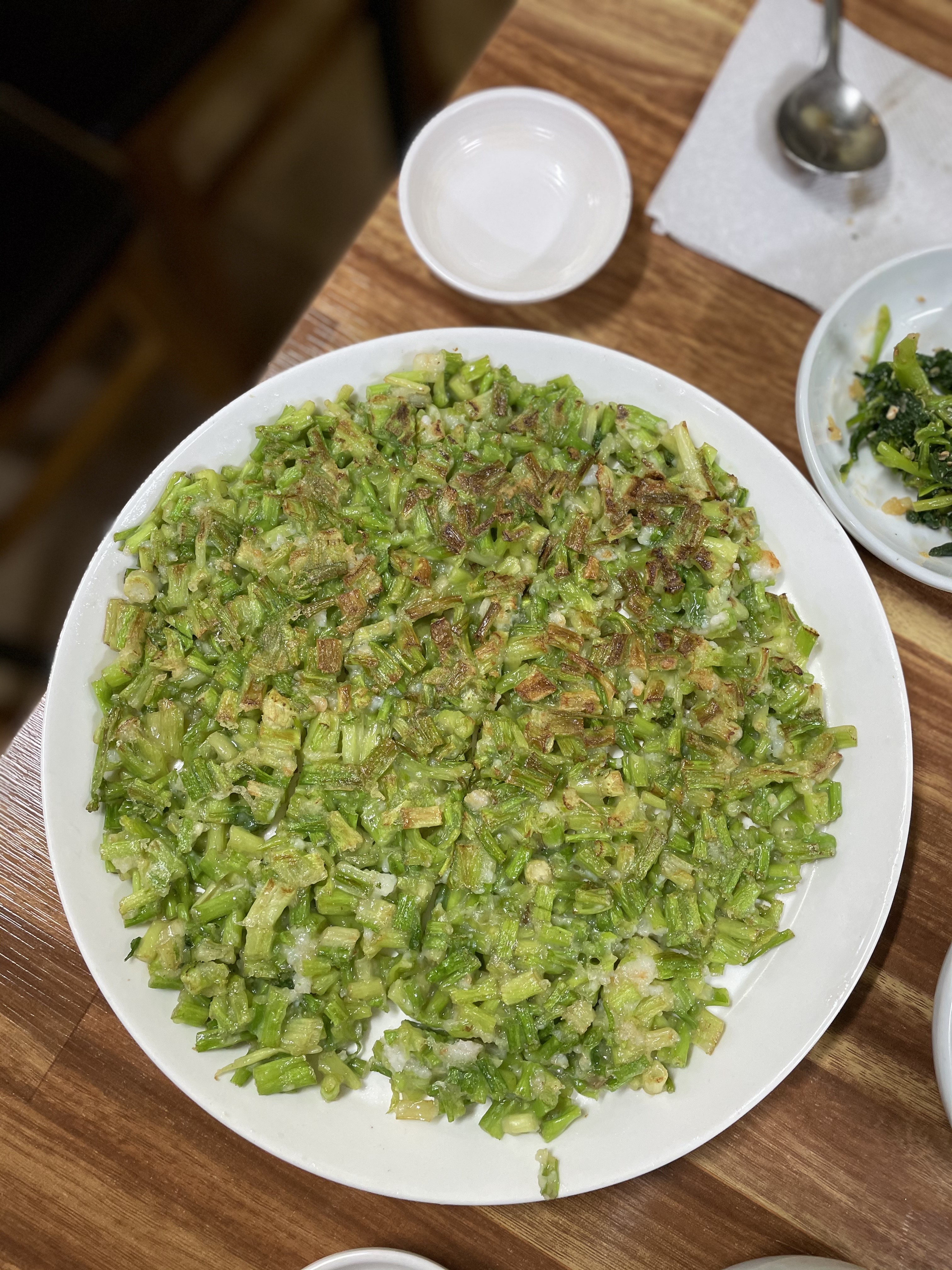 계절 메뉴인 미나리전은 밀가루반죽이 잘 보이지 않을 만큼 듬뿍 넣은 미나리와 새우를 잘게 썰어서 부쳐내는데, 그 향기가 입과 코를 아주 행복하게 하네요. 튀긴 듯한 식감의 전을 선호하는 개인적인 취향 탓에 조금만 더 바삭했으면 좋을 것 같다는 아쉬움이 남았지만 아마도 밀가루를 최소화했기 때문이라고 이해하는 것으로…. 겉바속촉의 감자전도 평이 좋더라고요.