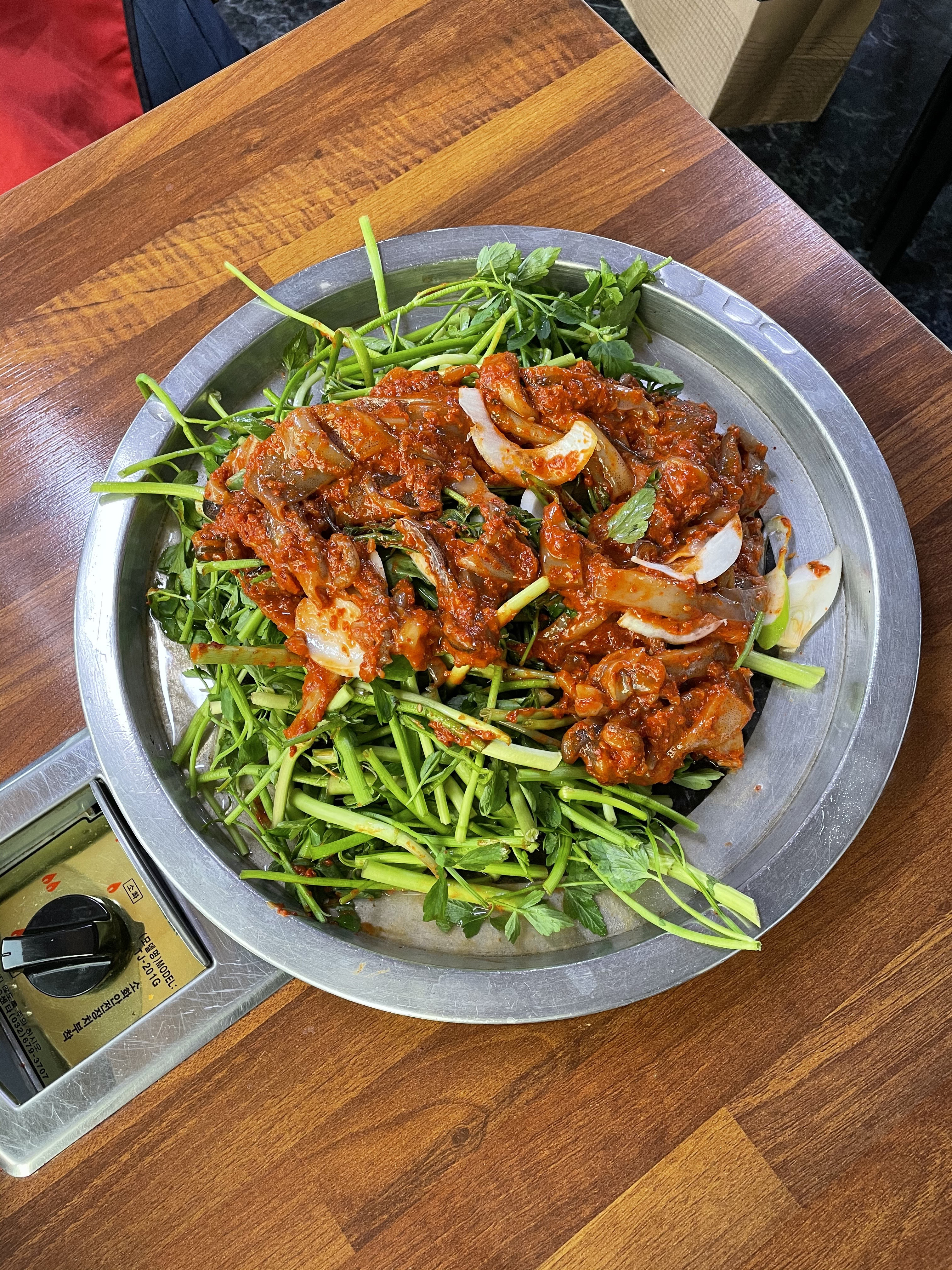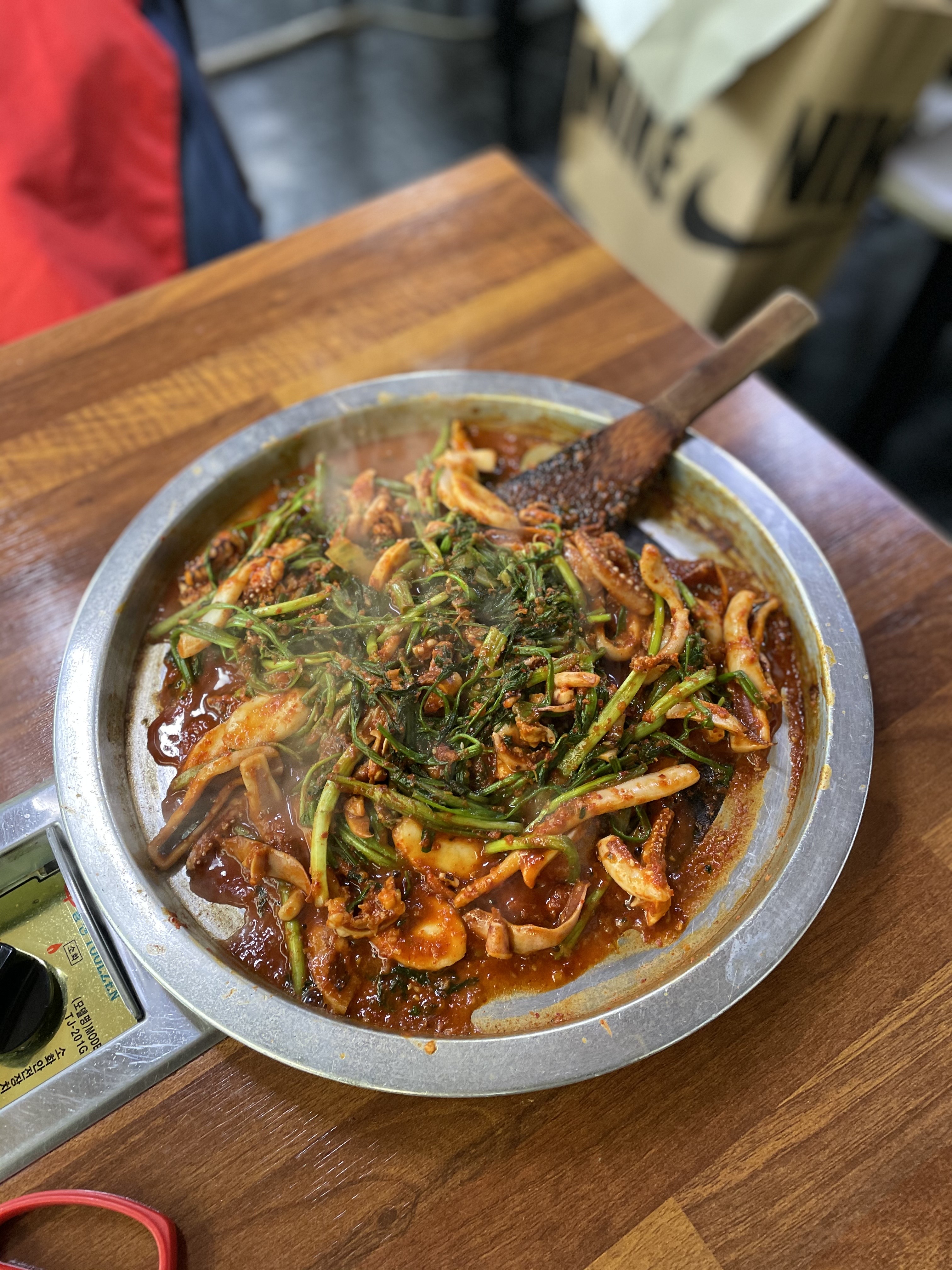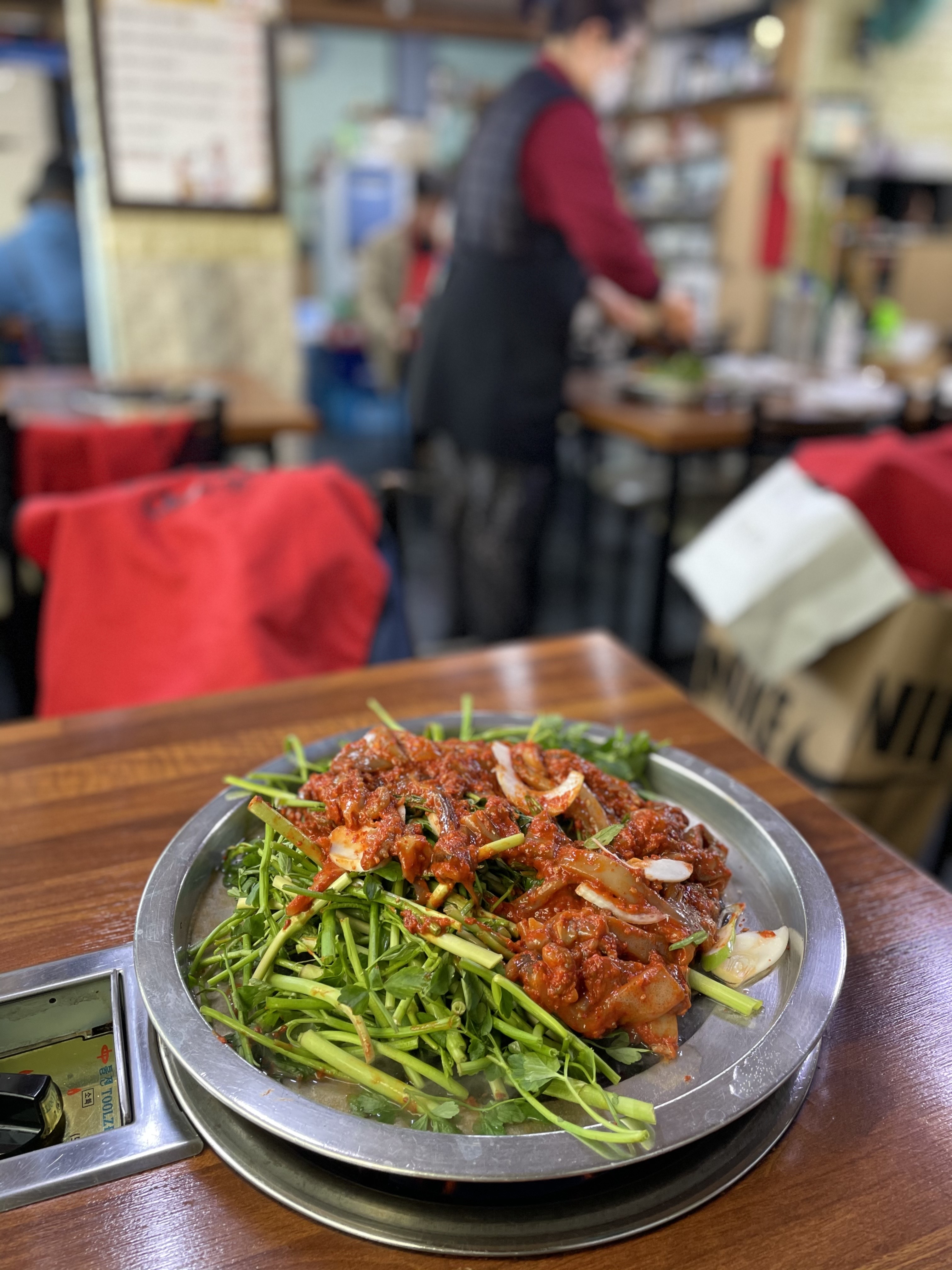 미나리가 오징어와 만나면 어떨까요? 관악구 신림동 순대골목에 위치한 ‘오첨지’는 30여년 된 노포인데, 이름에서 느껴지듯 오징어 불고기 전문점이죠.
