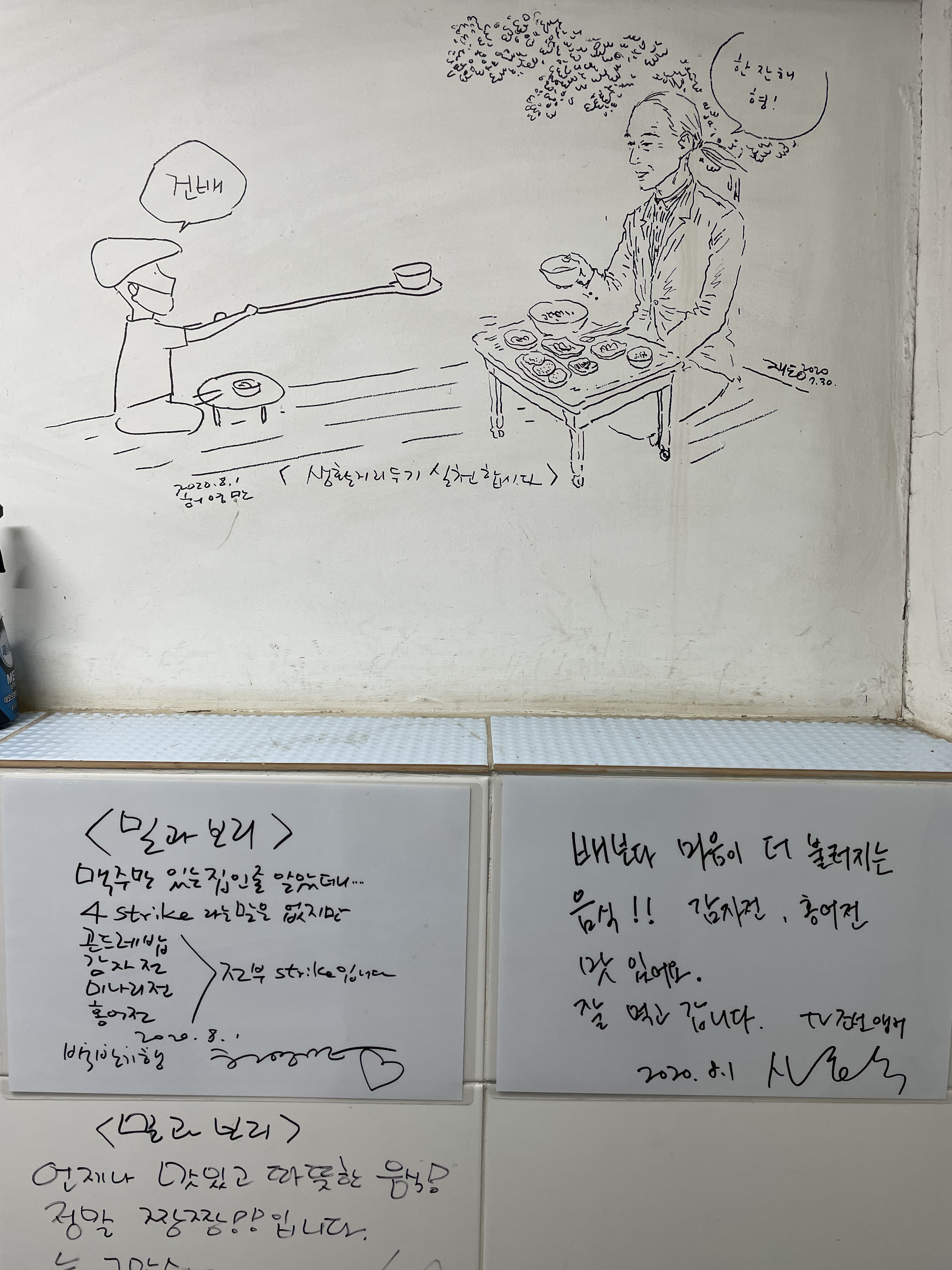 반찬 하나하나 맛깔나서도 좋지만 전체적으로 건강한 맛이 느껴져서 자주 방문하고픈 곳이네요. 허영만 화백이 그려놓은 벽의 그림을 보는 재미는 덤. 매장이 다소 협소하고 신발을 벗고 들어가야 하는 점이 조금 불편하네요.