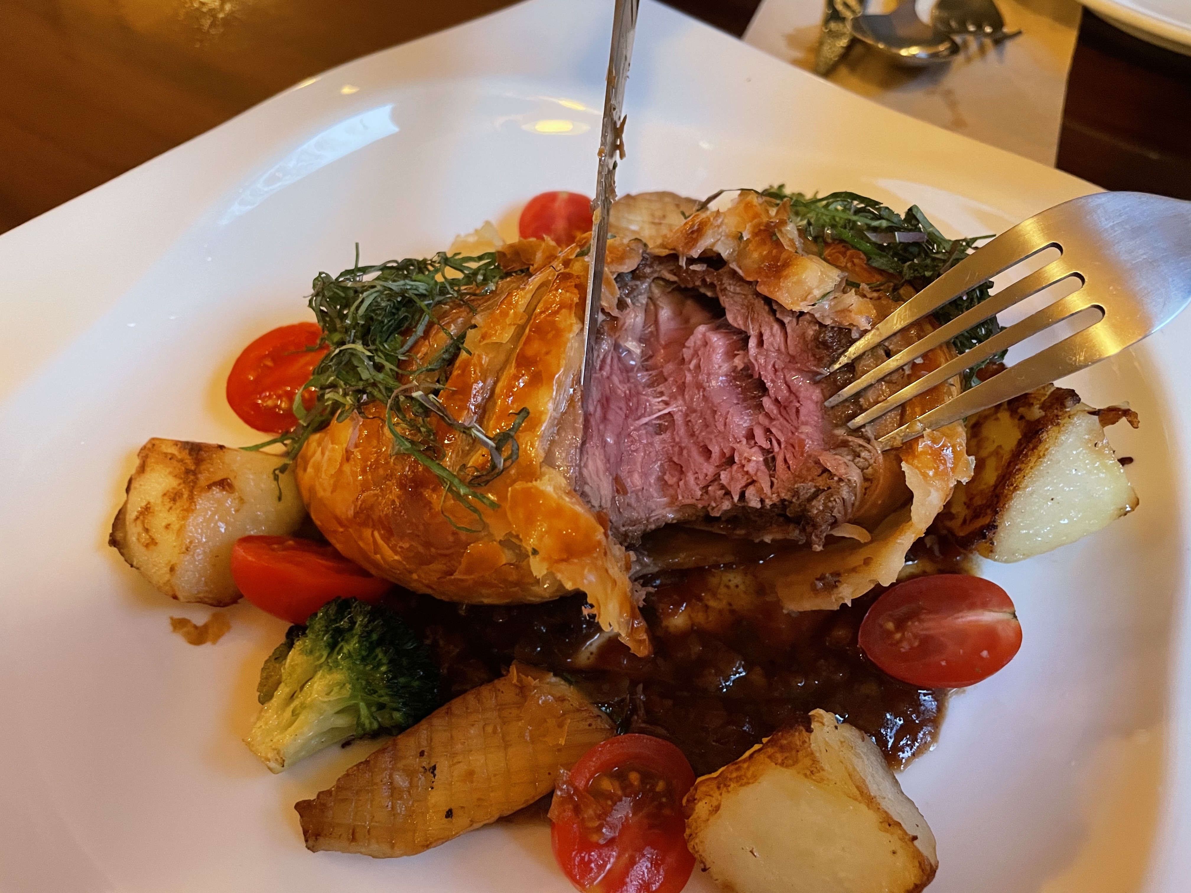 주바리가 이 집에서 꼭 맛보길 강력 추천하는 메뉴는 ‘비프웰링턴’인데요. 영국의 전쟁영웅 웰링턴 공작이 나폴레옹 군대를 격파한 뒤 그 업적을 기리기 위해 만들었다는 설이 있습니다. 부드러운 소고기 안심을 통째로 양념하고 프로슈토 등으로 감싼 후 겉을 다시 페스트리 반죽으로 싸서 오븐에 구워내는 영국 대표 가정식인 비프웰링턴은 조리시간이 오래 걸리기 때문에 미리 예약 주문해야 먹을 수 있어요.