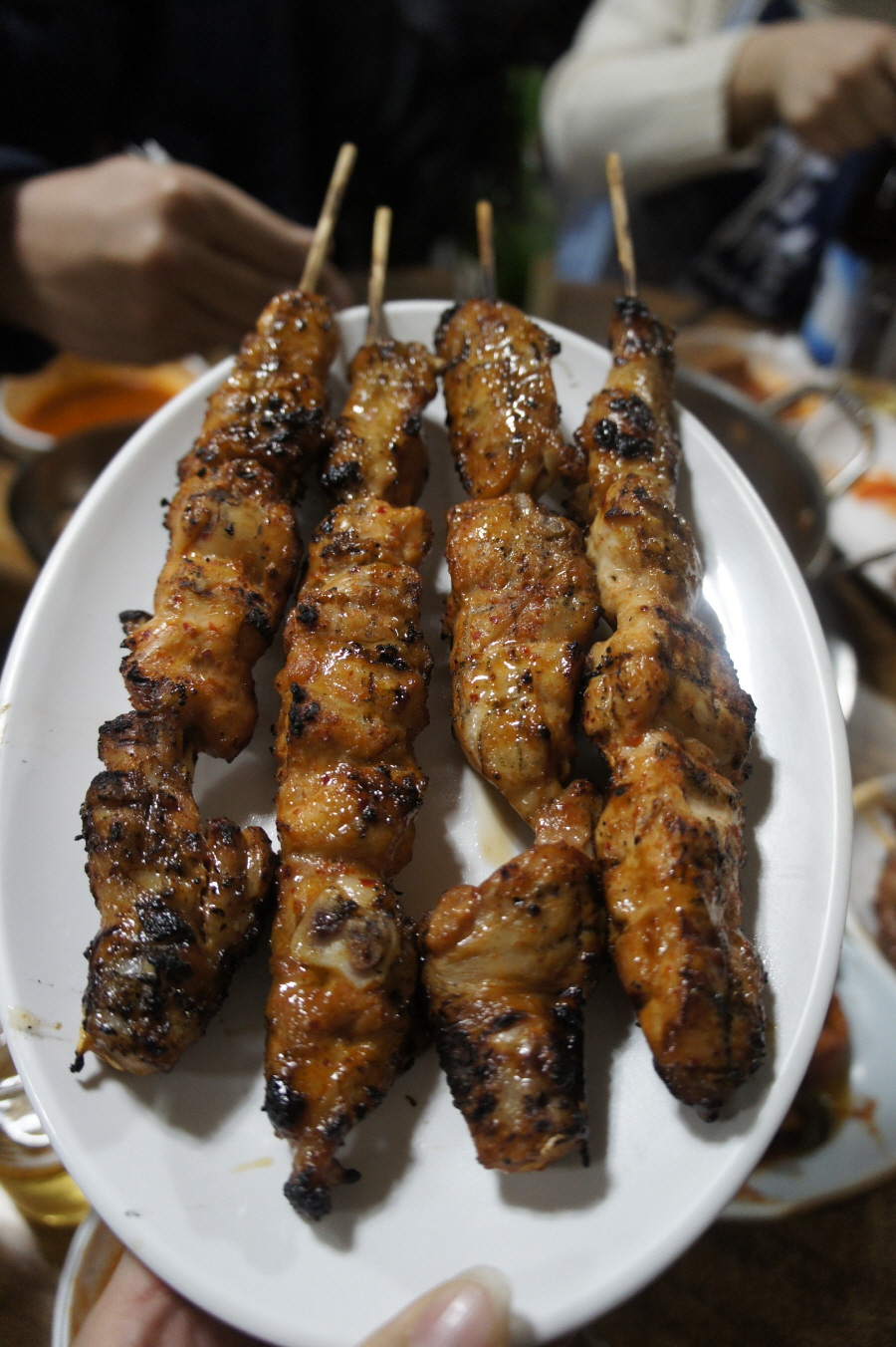 얽큰한 닭볶음탕도 맛 좋지만 주바리는 사이드메뉴 격인 닭꼬치를 오히려 최애메뉴로 꼽죠. 식당 앞 연탄화로에서 실시간으로 뒤집기를 반복하면서 익어 가는 닭꼬치들을 보면 일단 그 냄새를 맡은 위장이 배 속에서 아우성을 친답니다.