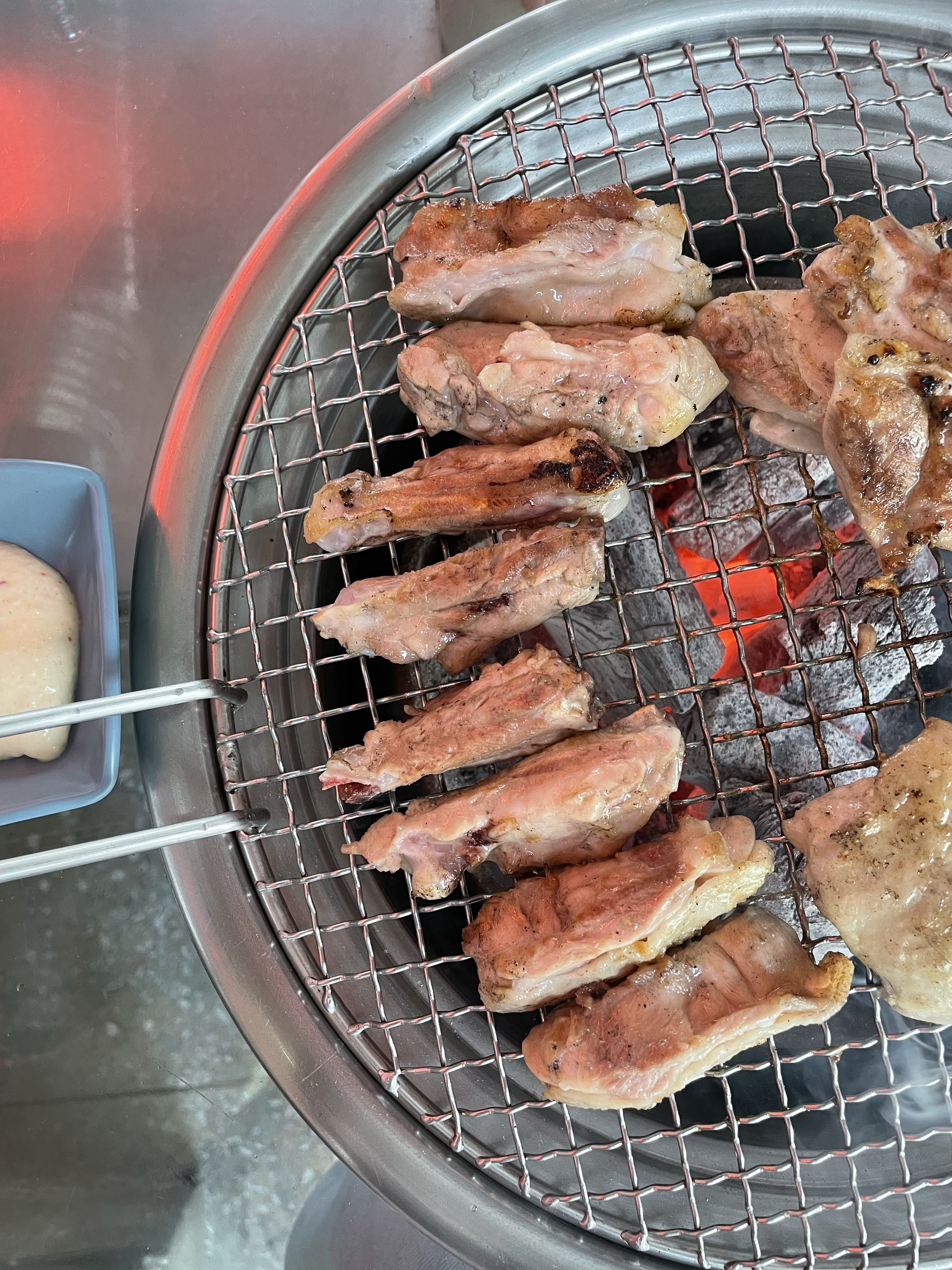 처음엔 소금구이를 주문해 드시고 추가할 땐 양념구이를 시키시는 게 제대로 맛보는 순서. 초벌구이해 나오는 고기는 직원들이 참숯 위에서 앞뒤로 노릇노릇하게 뒤집어가며 처음부터 끝까지 먹기 좋게 구워주니 편하더라고요.
