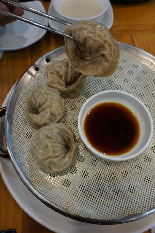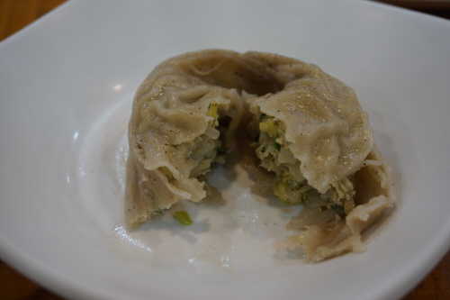 애피타이저로 주문한 메밀 손만두(반접시 양)는 고기와 김치 맛이 섞여 나오는데 김치만두는 아주 매운 편이라 어린이들에겐 비추.