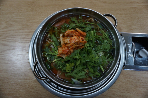 부대찌개 2인분의 비주얼. 처음에 나오면 초록초록하기만 해서 실망하실수도 있겠지만,... 일단 좀 끓여보는 걸로..