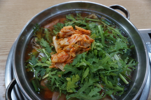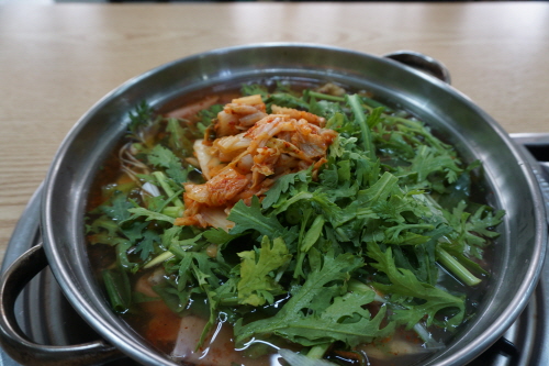 부대찌개 2인분의 비주얼. 처음에 나오면 초록초록하기만 해서 실망하실수도 있겠지만,... 일단 좀 끓여보는 걸로..