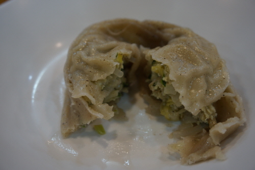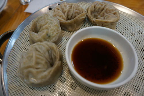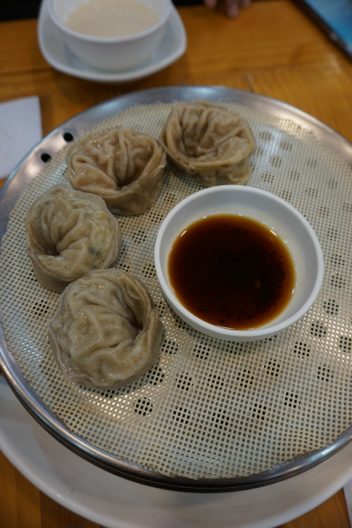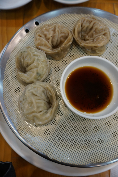 애피타이저로 주문한 메밀 손만두(반접시 양)는 고기와 김치 맛이 섞여 나오는데 김치만두는 아주 매운 편이라 어린이들에겐 비추.