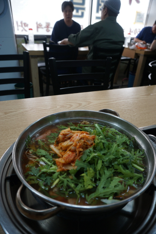 텁텁하지 않고 감칠맛 나는 국물 맛의 비결은 닭고기 육수와 듬뿍 들어가는 쑥갓 덕이라고 하네요. 쑥갓에 가려져 내용물이 잘 안보이지만 헤치고 보면 빈약하지 않아요. 향이 좋아서 이 집만의 치트키 되겠네요.