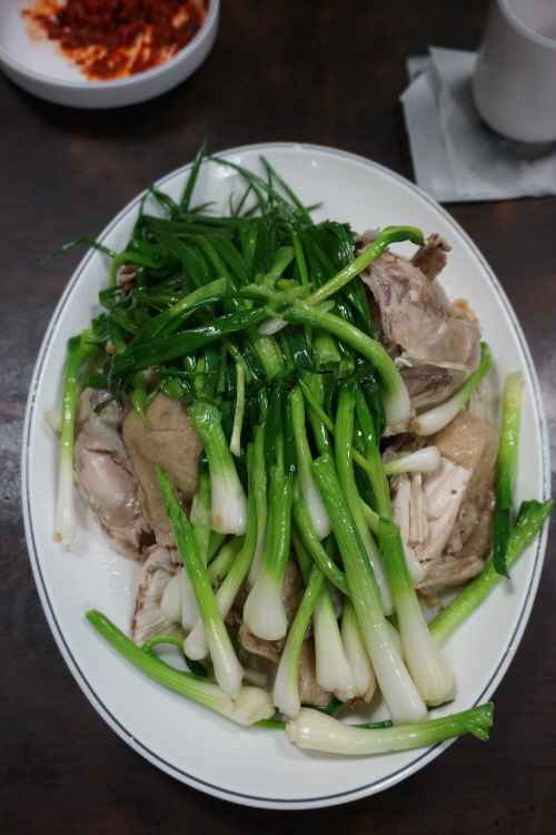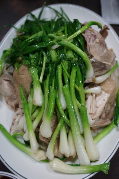 만포막국수의 백숙은 일단 닭 살코기의 적당한 쫄깃함과 부드러움이 입 안에서 팽팽한 줄다리기를 벌이는 듯해요. 겨자를 섞은 특제 양념소스에 찍으면 감칠맛 2배. 특히 데친 파가 듬뿍 올려져 있는 것이 이 집의 하드캐리.