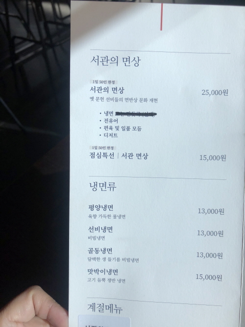 먼저 1일 20인 한정된 점심특선으로 선뵈는 ‘서관 면상’을 드셔 보길 강추. 1만 5000원의 가격에 냉면과 편육, 녹두빈대떡, 디저트까지 서빙되는데, 평양냉면 단품이 1만 3000원인 점을 감안하면 가성비가 좋거든요. 참고로 저녁 면상은 2만 5000원이랍니다.