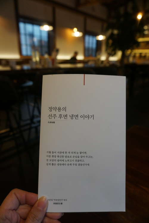 ‘선주후면’을 즐겼다는 다산 정약용의 냉면에 관한 글귀에도 등장하는 ‘서관’은 황해도와 평안도를 아우르는 말이라네요. 한옥의 고풍스러움에 모던한 인테리어를 접목한 매장 분위기에 첫인상은 일단 합격.
