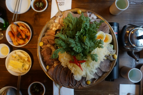 뚜껑이 덮인 그릇에 담긴 것은....편육. 식지 않도록 했네요.