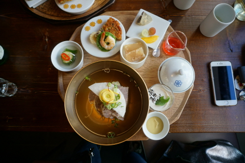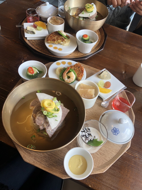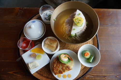 예쁨까지 장착한 쟁반 한상을 받아 들면 행복한 미소가 절로 지어질 거예요. 냉면 육수는 간간하면서 육향이 진한 편이고 계란 반쪽 대신 지단이 올려져 있는 것도 특징인데, 노른자 때문에 육수가 탁해지는 게 싫은 분이라면 선호하실 듯.