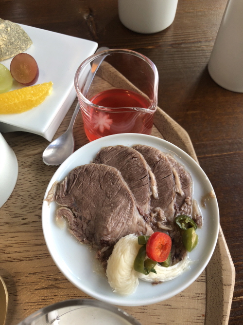 뚜껑이 덮인 그릇에 담긴 것은....편육. 식지 않도록 했네요.