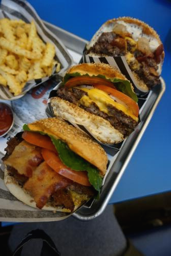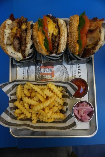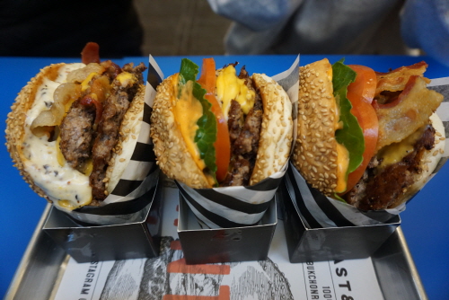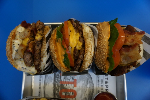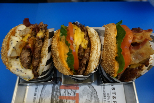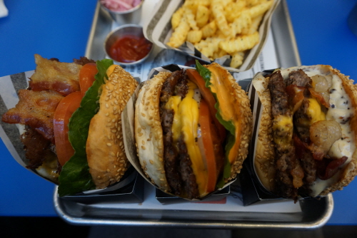 왼쪽부터 차례로 더블트러플 버거, 더블치즈 버거, 더블베이컨 버거. 색감도 참 예쁩니다.