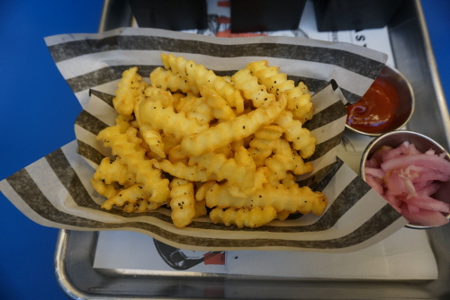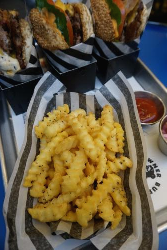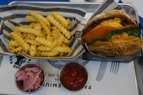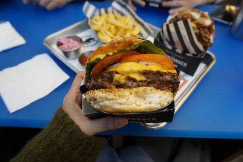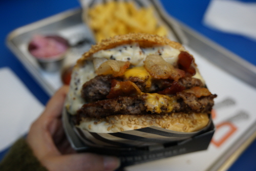 특히 이 집 메뉴 이름에는 ‘더블’이 들어간 것들이 많더라고요. ‘더블더블 버거’는 기본에 패티가 2장 들어간 메뉴, ‘더블 베이컨 버거’은 베이컨 덕후에게 추천할 만하고, ‘더블트러플 버거’는 트러플마요 소스가 인상적이에요. 재료 구성은 여타 수제버거와 흡사하지만 이 집만의 특제소스가 맛의 비결인 듯해요. 깨가 많이 올라간 번은 보들보들한 것이 쉐이크쉑의 것과 비슷한 느낌이네요.