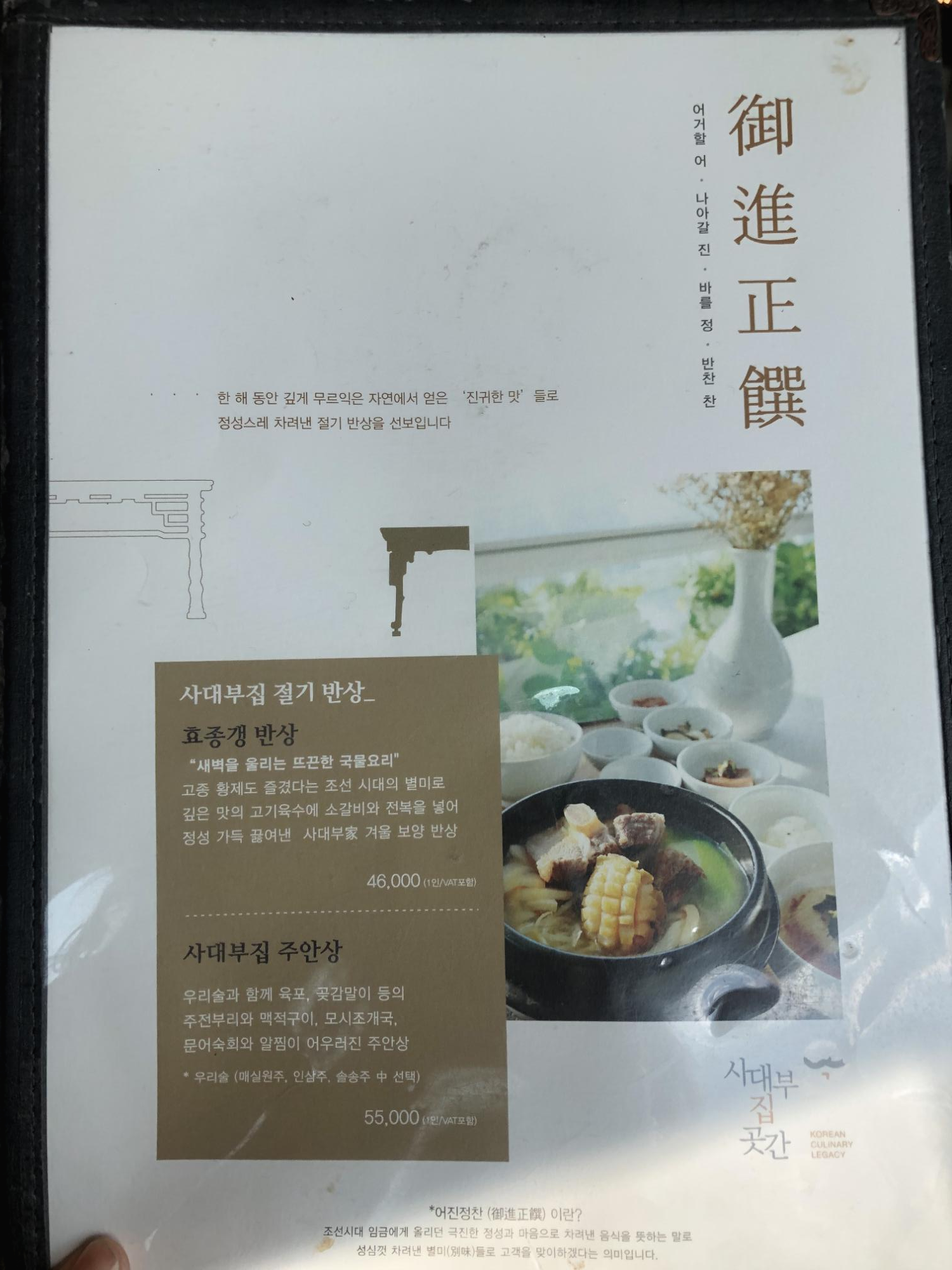기사식당만큼 저렴하지는 않지만 사대부집 곳간은 조용한 가족모임이나 돌잔치 등을 하기에 안성맞춤이더라고요. 죽·샐러드부터 고기요리 등 허투루 내논 음식이 없이 맛과 정성이 느껴졌는데 특히 튀김과 전 요리가 맛있기로 유명하다네요.