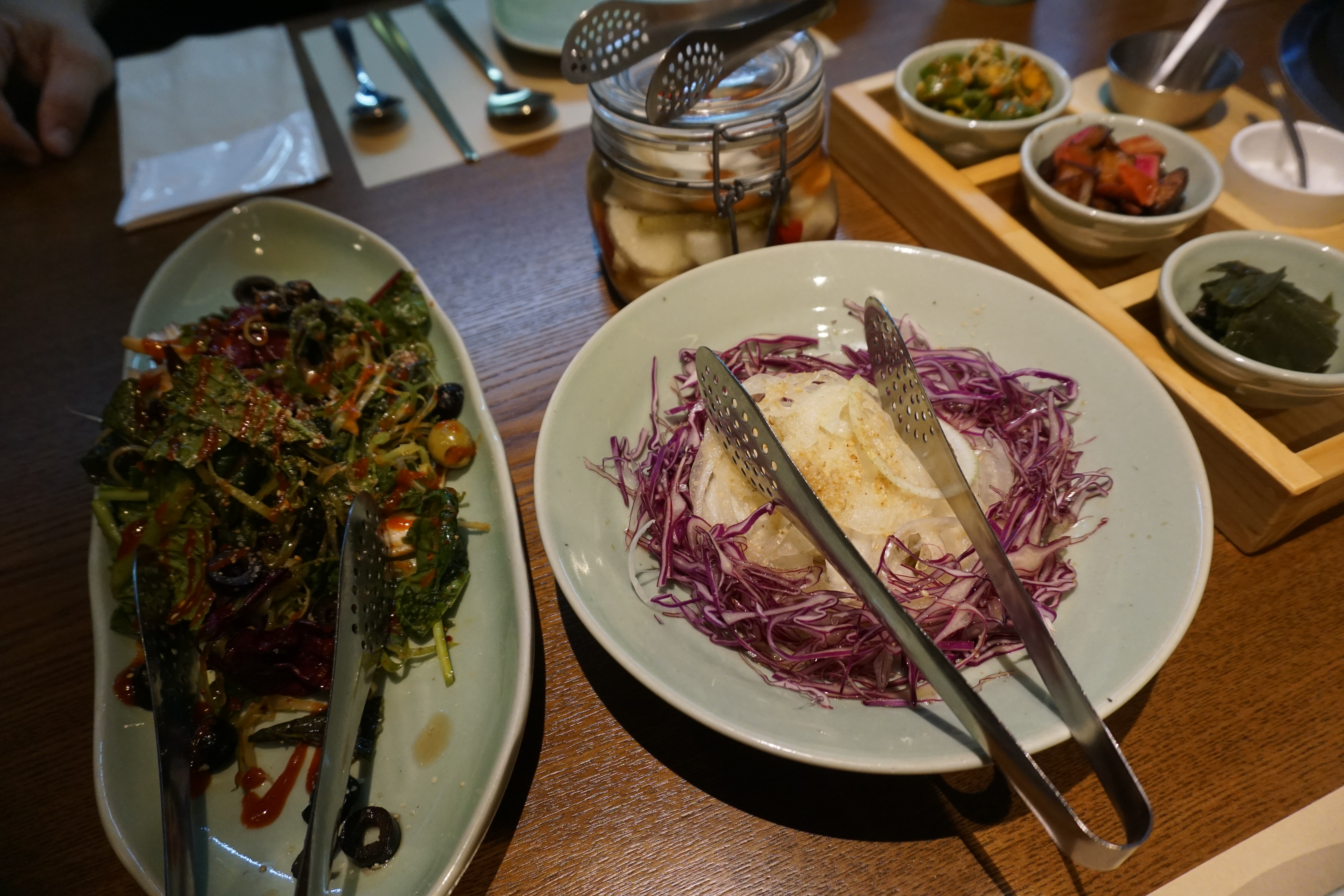 소금, 생와사비, 홀그레인머스타드 3가지의 소스를 차례로 찍어 먹으면 다양한 맛의 변주가 가능하죠. 직영농장에서 공수한 야채만을 사용한다는 샐러드와 반찬들도 신선하고 정갈해요.