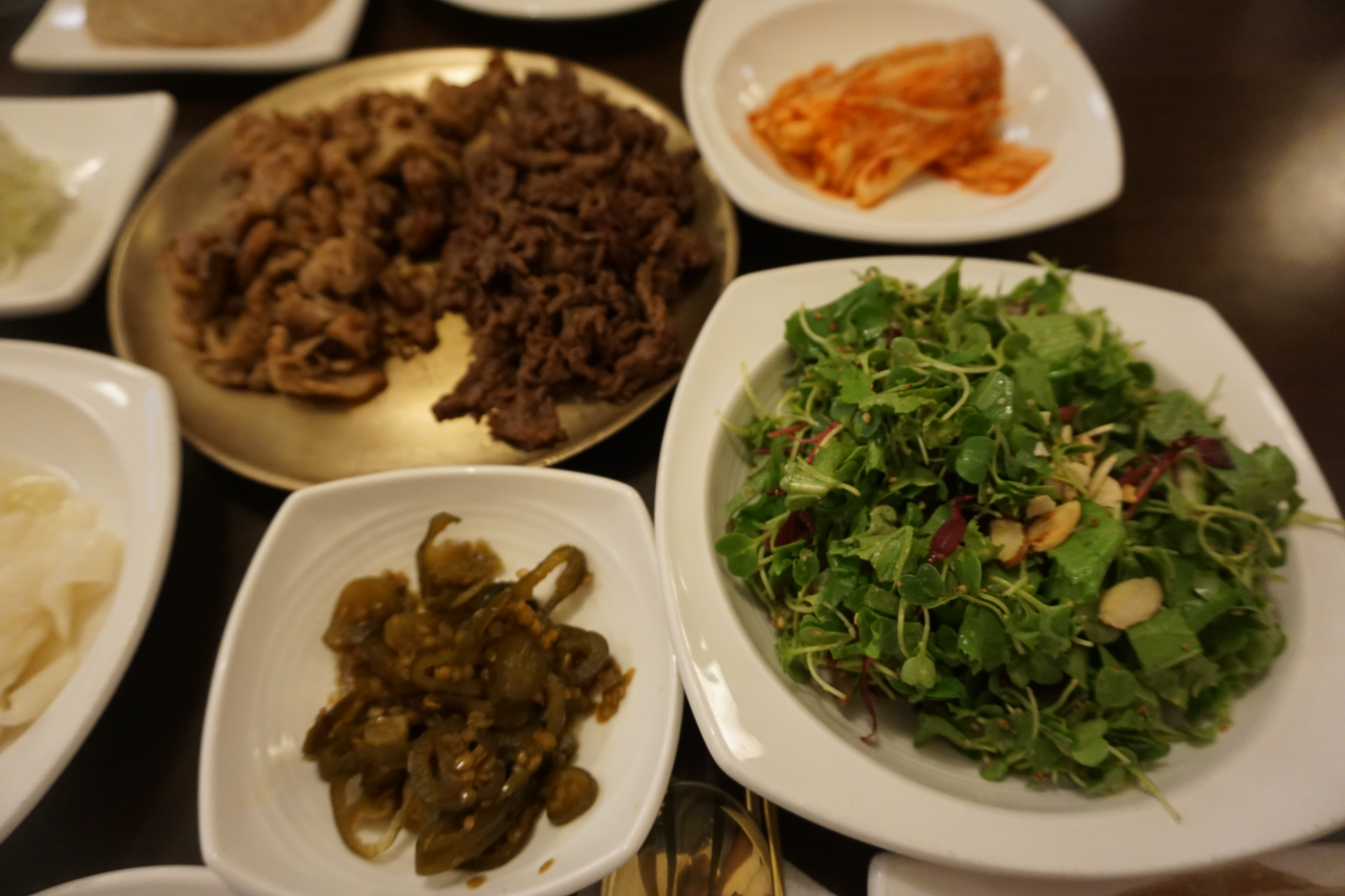 숯불 불고기는 돼지와 소 두 가지 종류가 있는데 인원수에 맞게 주문을 하면 차려지는 메밀 쌈에 불맛 제대로인 고기와 고소한 참깨 겨자소스를 뿌린 샐러드, 나물 등을 함께 올려 싸먹으면 담백한 그 맛이 기가 막히죠.