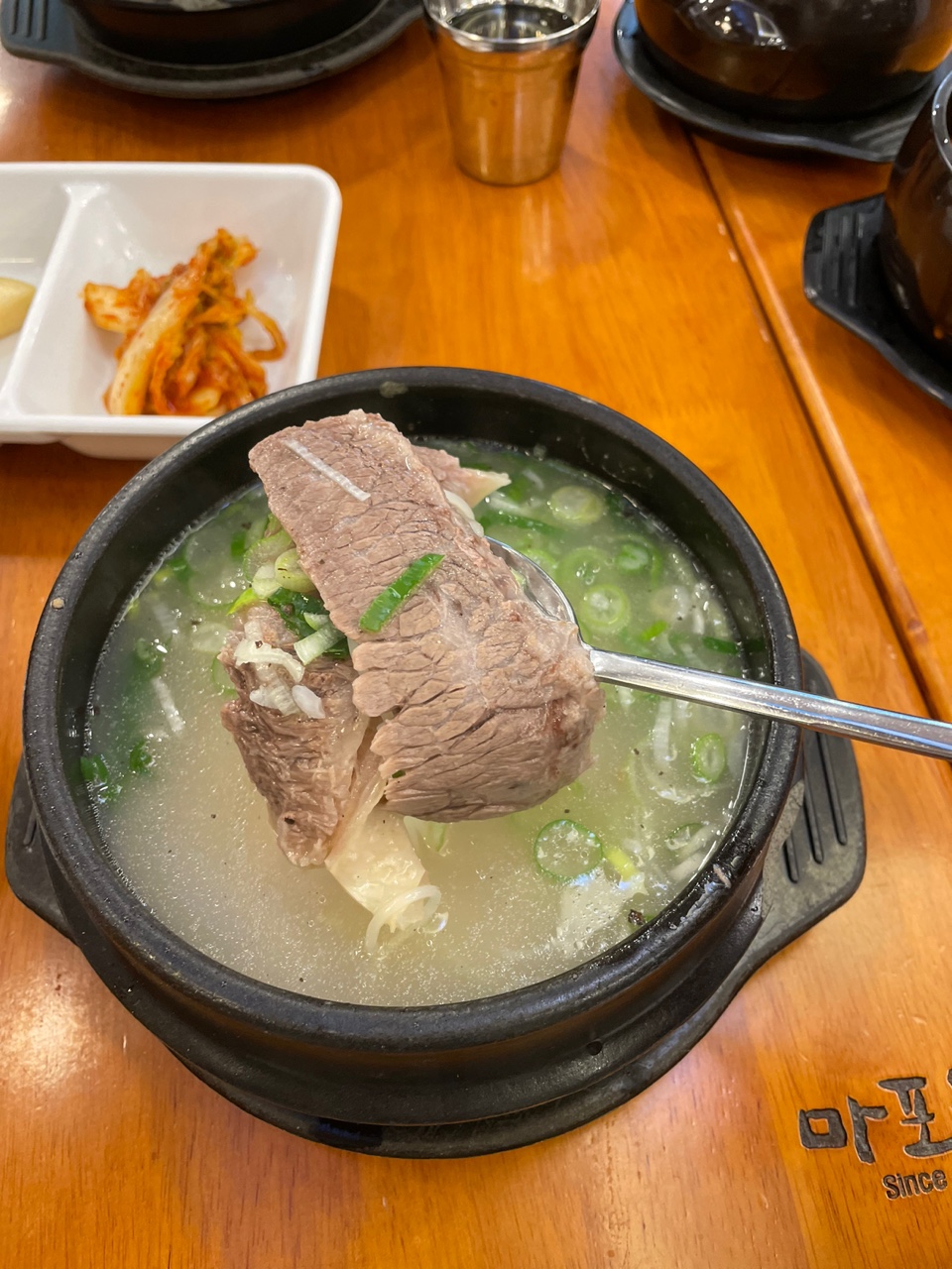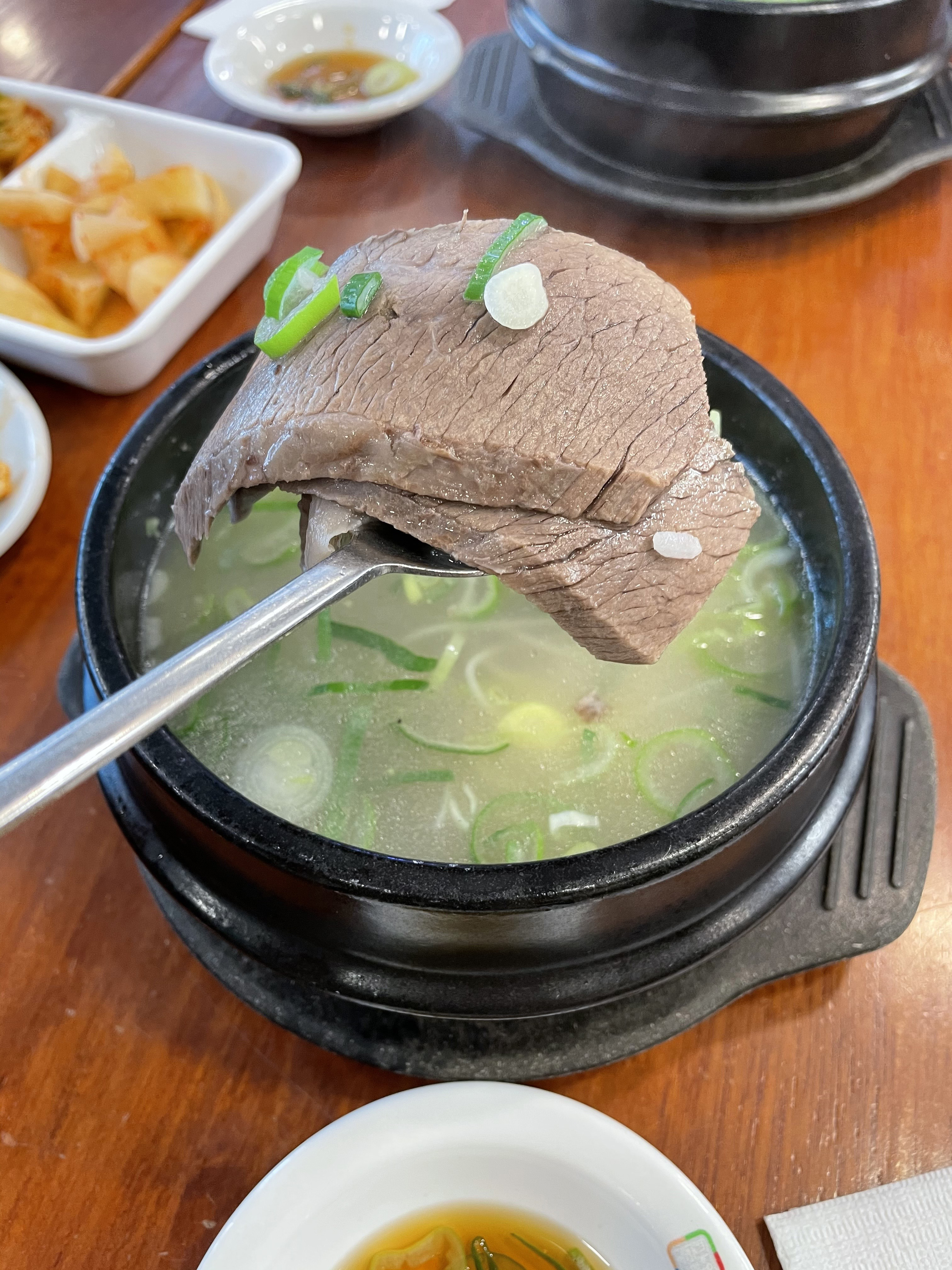 퀄리티 좋은 한우를 사용하기에 양지설렁탕 1만 5000원, 명품양지설렁탕은 2만원으로 녹록지 않은 가격이지만 한 번 맛보시면 고개를 끄덕끄덕하실 거예요. 보통과 명품의 가격 차는 고기의 양이 아닌 퀄리티의 차이. 국물은 잡내 없이 깔끔하면서도 깊은 맛이 살아 있고 퍽퍽함이라고는 1도 느껴지지 않는 고기가 듬뿍 들어있어, ‘완국’ 하면 단전에서부터 힘이 불끈 솟아나는 듯한 기분이 느껴져요. 프랜차이즈 설렁탕집에서 느껴지는 인위적인 진한 색깔과 맛의 국물과는 비교 거부.