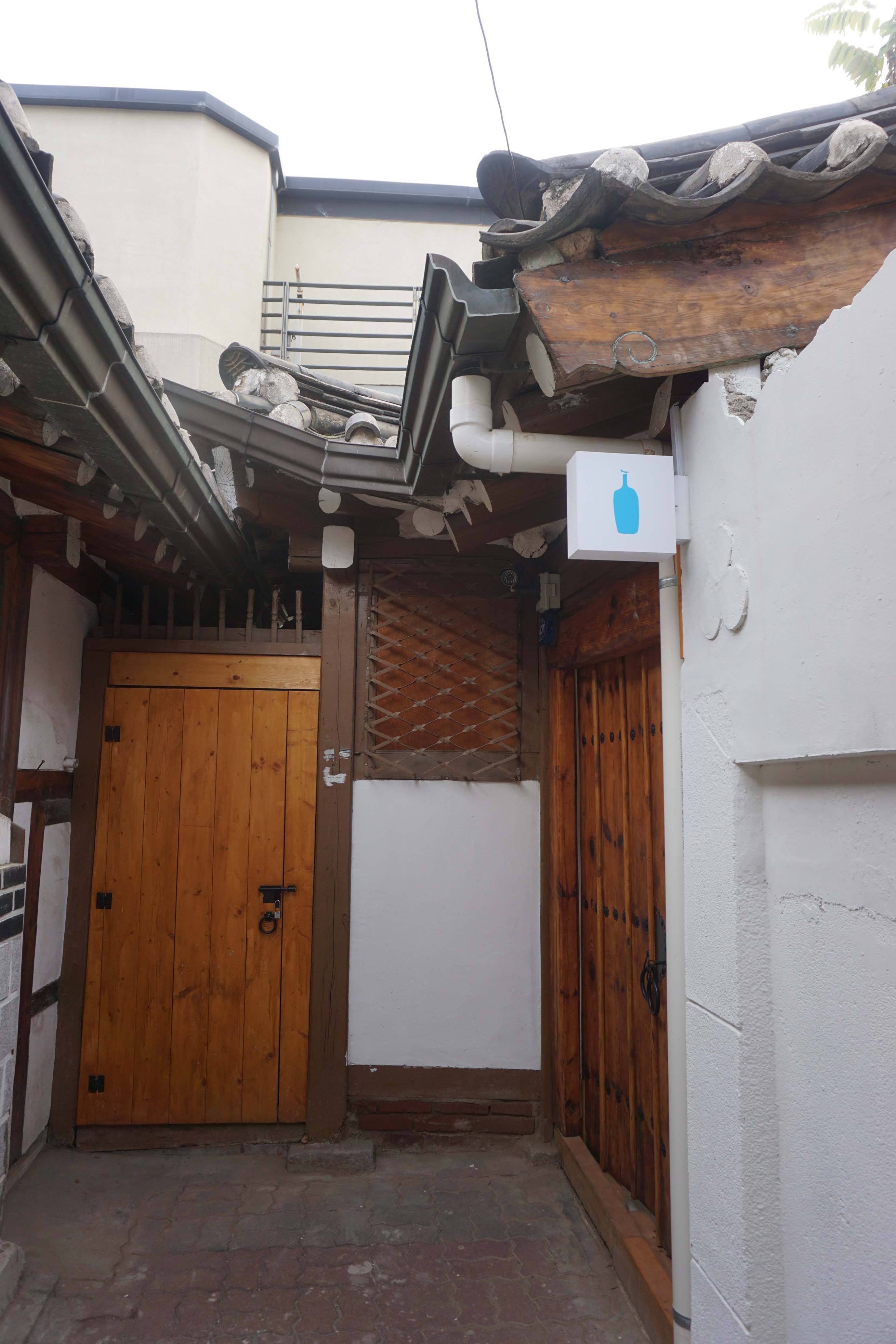 담벼락에 음각으로 새겨놓은 블루보틀 로고도 참 개성 만점이에요.